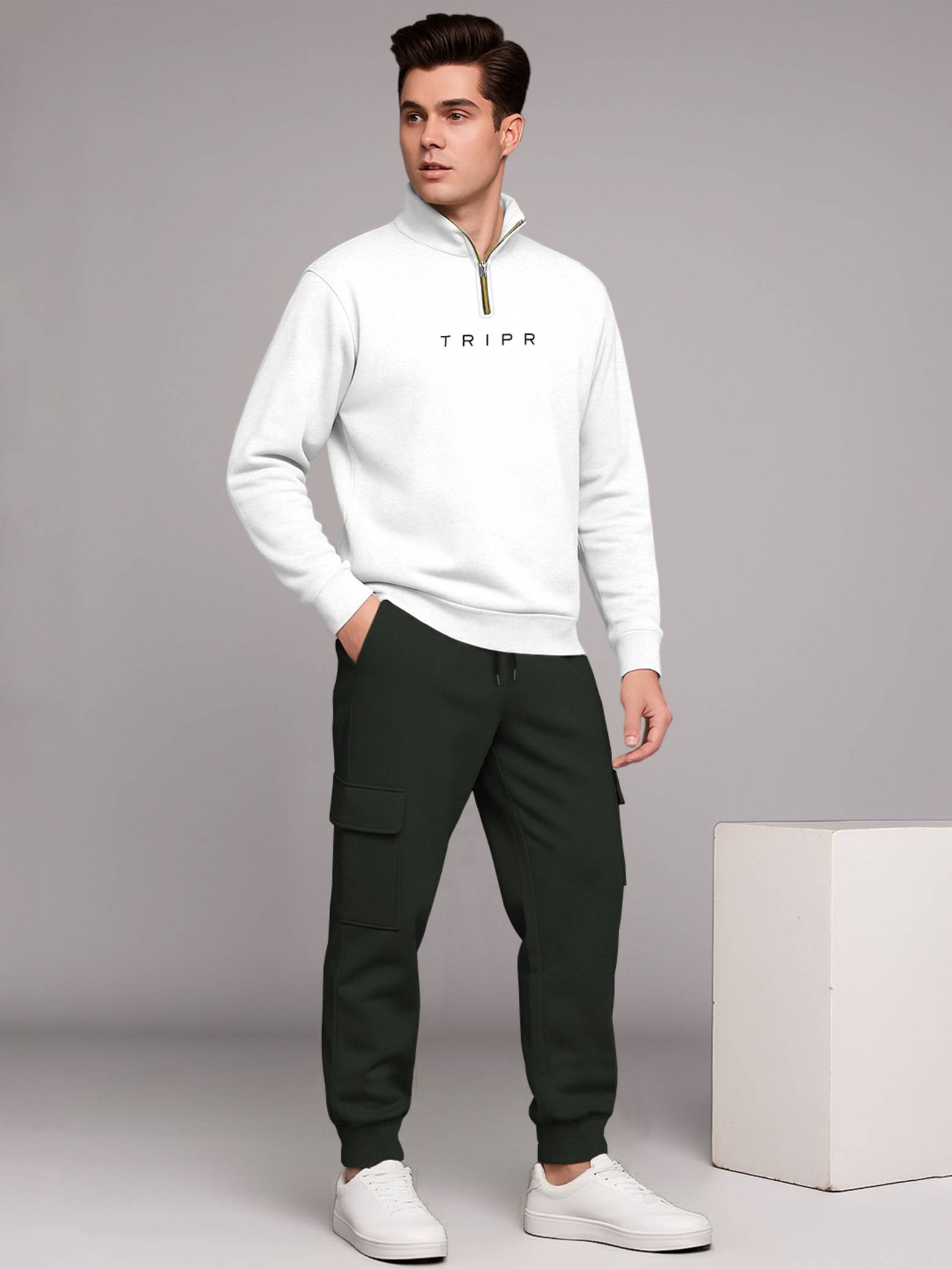Stay on-trend and comfortable with this stylish TRIPR full sleeve Henley Neck perfectly paired with baggy cargo pants. The Sweatshirt features a sleek zip-up neckline that adds a sporty, modern touch, while its relaxed fit ensures all-day comfort. The TRIPR cargo pants come with a loose, baggy silhouette and multiple utility pockets, offering the ideal combination of function and fashion. Whether you're heading out for streetwear-inspired looks, traveling, or enjoying a laid-back weekend, this outfit delivers a bold blend of contemporary style and everyday practicality - only from TRIPR.A Cargo plain baggy tracksuit typically consists of a loose-fitting, unadorned Sweatshirt and matching pants, usually made from soft, comfortable materials like cotton blends.