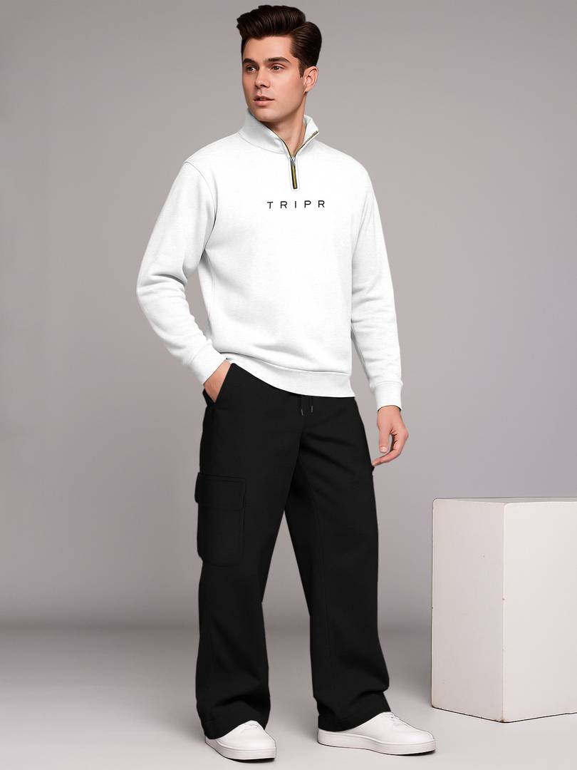 Stay on-trend and comfortable with this stylish TRIPR full sleeve high neck zipper sweatshirt, perfectly paired with baggy cargo pants. The sweatshirt features a sleek zip-up neckline that adds a sporty, modern touch, while its relaxed fit ensures all-day comfort. The TRIPR cargo pants come with a loose, baggy silhouette and multiple utility pockets, offering the ideal combination of function and fashion. Whether you're heading out for streetwear-inspired looks, traveling, or enjoying a laid-back weekend, this outfit delivers a bold blend of contemporary style and everyday practicality - only from TRIPR.