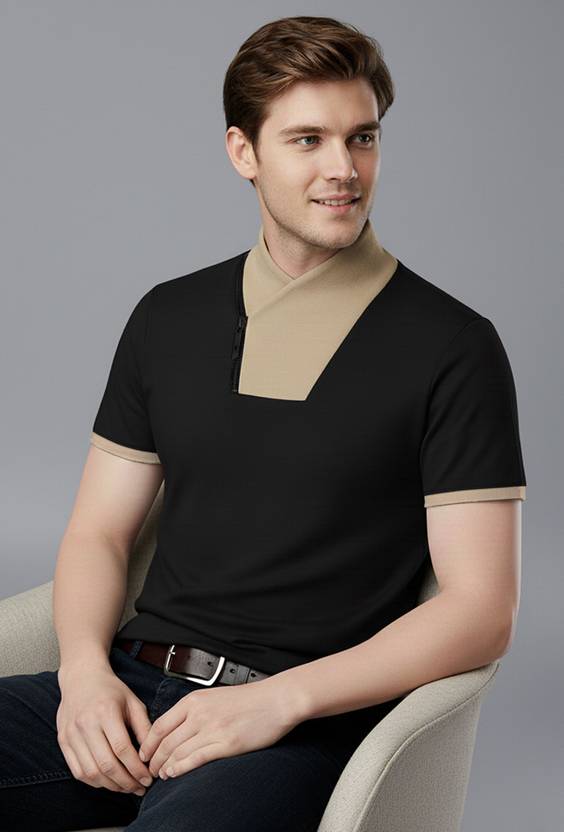 Elevate your casual wardrobe with this statement piece from TRIPR. Designed for the man who appreciates unique details, this T-shirt features a bold, asymmetrical wrap collar with a functional zipper accent. The contrast between the black body and solid beige neck and sleeve trims creates a sophisticated, structured look that transitions easily from day to night.