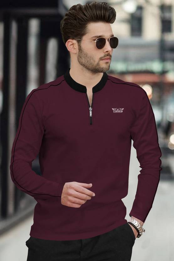Elevate your casual style with the TRIPR Men's Cotton Blend Mandarin Collar T-Shirt. Designed for the man who values both comfort and a structured silhouette, this full-sleeve tee features a unique quarter-zip Mandarin collar and striking racing-stripe piping along the shoulders and arms.