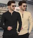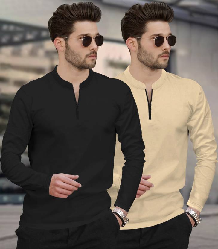 TRIPR Pack of 2 Men Solid Mandarin Collar Cotton Blend Black, Beige T-Shirt