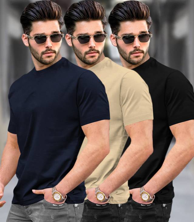 TRIPR Pack of 3 Men Solid Round Neck Cotton Blend Multicolor T-Shirt