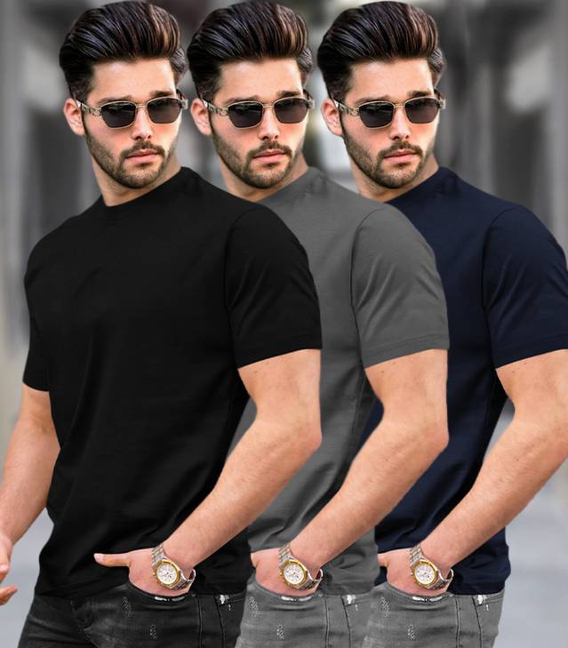 TRIPR Pack of 3 Men Solid Round Neck Cotton Blend Multicolor T-Shirt