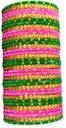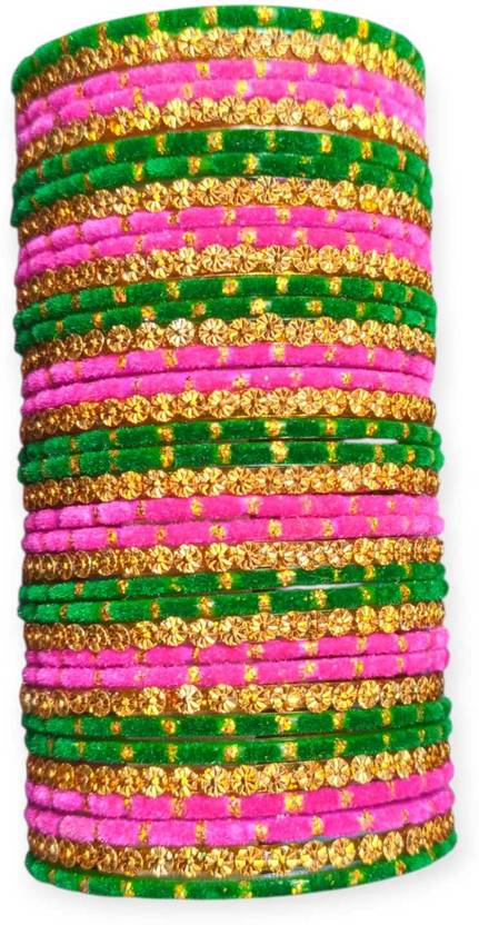 This vibrant pink and green velvet bangle set is a stunning blend of traditional charm and festive elegance. The bangles are wrapped in soft velvet fabric, beautifully arranged in alternating bright pink and rich green colors. Each layer is highlighted with golden floral stone lines and fine golden dot detailing, adding sparkle and a luxurious finish.