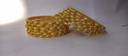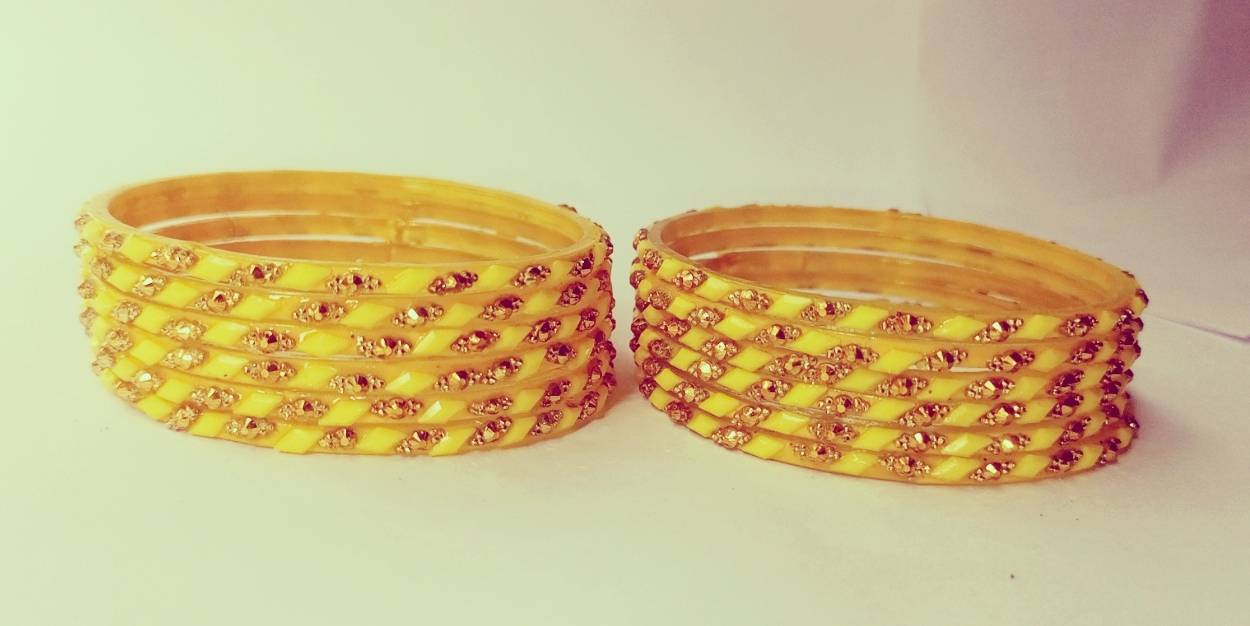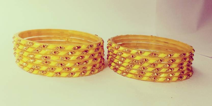 Add a touch to elegance to your traditional look with these beautiful crafted Yellow Gold Fish Designer glass bangles. Featuring a Stylish twisted pattern with golden stone embellishments ,these bangles offer a perfect blend of tradition and modern charm. Made from high quality glass, They arer light weight, smooth to wear, and ideal for daily wear as well as festive occasions.