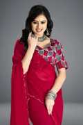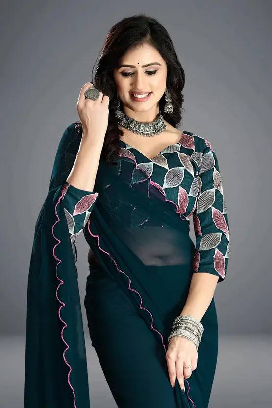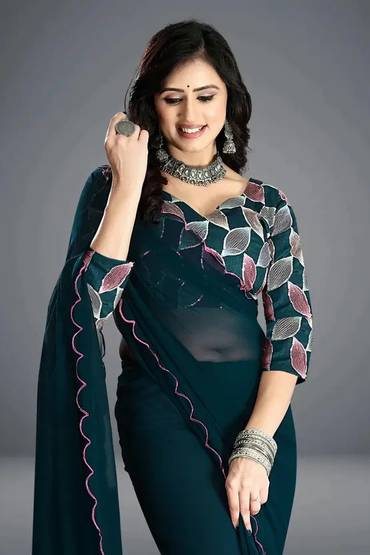 Solid border saree with elegant thread embroidered blouse design. Saree has a plain pattern and smooth texture giving it a classy and graceful appearance. Perfect for festive, traditional, and casual wear occasions.