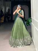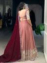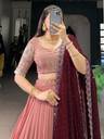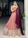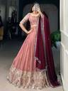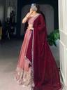 Step into timeless elegance with this stunning sage Pink lehenga set, crafted from luxurious silk fabric. The flared skirt features delicate floral embroidery along the hemline, adding a touch of sophistication and charm. The matching half-sleeve blouse is beautifully tailored for a flattering fit, while the Maroon dupatta with silver sequin work and an embellished border perfectly complements the ensemble.