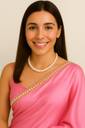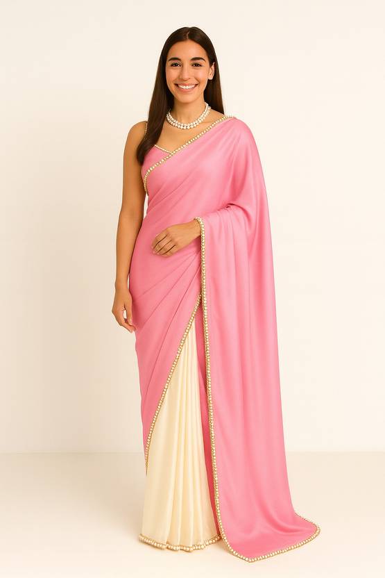 Step into timeless elegance with this modern satin saree featuring a soft peach-rose hue complemented by an ivory pleated drape. Adorned with delicate pearl edging, this ensemble blends classic sophistication with a contemporary twist. Perfectly styled with an open-hair look, statement pearl necklace, and a sleek diamond-finish watch, the royal chair sitting pose highlights its luxurious fabric and graceful fall — ideal for weddings, parties, or high-fashion shoots.