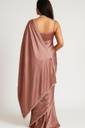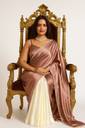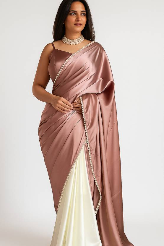 Step into timeless elegance with this modern satin saree featuring a soft peach-rose hue complemented by an ivory pleated drape. Adorned with delicate pearl edging, this ensemble blends classic sophistication with a contemporary twist. Perfectly styled with an open-hair look, statement pearl necklace, and a sleek diamond-finish watch, the royal chair sitting pose highlights its luxurious fabric and graceful fall — ideal for weddings, parties, or high-fashion shoots.