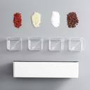 1. MULTI-PURPOSE: The condiment shelf is suitable for placing any spices you need, such as salt, sugar, pepper, baking soda, onion powder, ginger powder, tea, coffee, etc., to prevent the condiments from mixing. 2. SAVE SPACE: You will get a 4 grid seasoning box, which can store the condiments commonly used in the kitchen. The flip-lid design can be operated with one hand and is convenient to use. The wall-mounted design does not take up countertop space and makes your kitchen more tidy. 3. HIGH-QUALITY MATERIALS: The wall-mounted condiment storage box is made of food-grade PP plastic, which is safe, non-toxic, no peculiar smell, sturdy and durable, detachable, easy to clean, and reusable. 4. LARGE CAPACITY DESIGN: The size of the seasoning box is 11.61*3.34*2.95in, and the large capacity can store more condiments at the same time. 5. SAFE FOR SPICESE : The lid keeps the spices away from dust and moisture, keeps the spices fresh and prolongs the storage time.