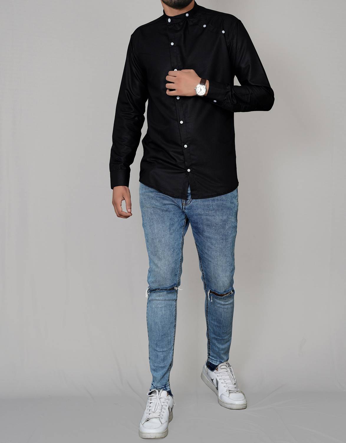 Men Regular Fit Solid Mandarin Collar Casual Shirt