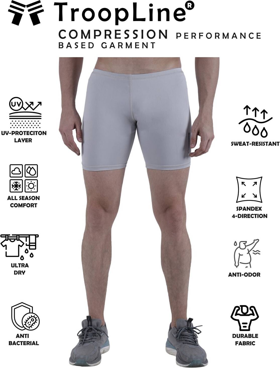 Pack of 1 TroopLine Compression shorts Suitable For Gym Workout, Available in 5 colors -BLACK, NAVY BLUE, WHITE, LIGHT GREY AND DARK GREY, designed for athletes and fitness enthusiasts. Our advanced moisture-wicking fabric keeps you dry and comfortable during intense workouts.