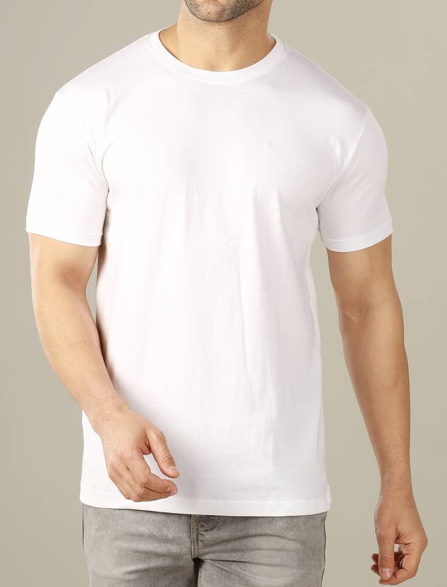 TRPR Men Solid Round Neck Cotton Blend White T-Shirt