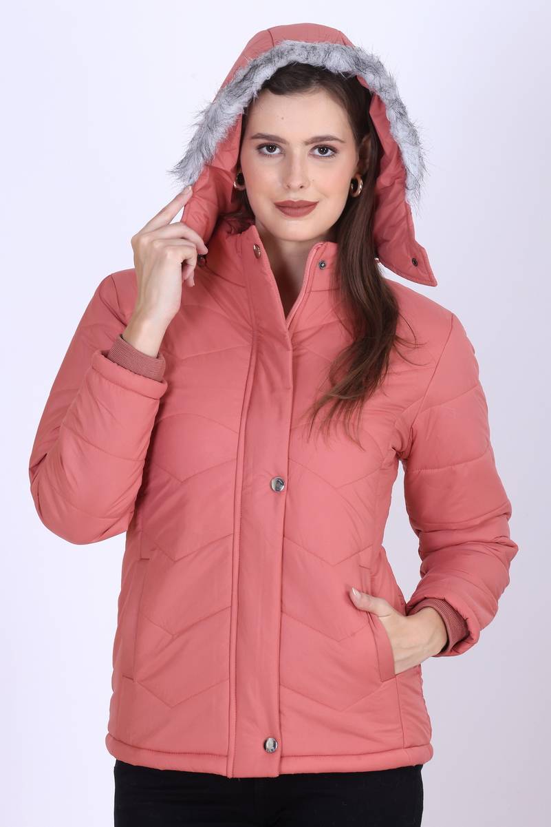solid lightweight puffer jacket with faux fur trim, has a hooded, 2 pockets ,has a zip closure, long sleeves, straight hemline, polyester lining