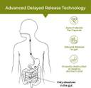 Advanced DR= Delayed Release Technology ensures more probiotic per capsule/ Each capsule releases the probiotic only once it reaches the gut ensuring maximum absorption of the quantity of probiotics (approximately 90%) every time it is consumed, compared to normal capsules which get a percentage of their dose destroyed by the stomach’s acid preventing the needed dosage from reaching the gut.