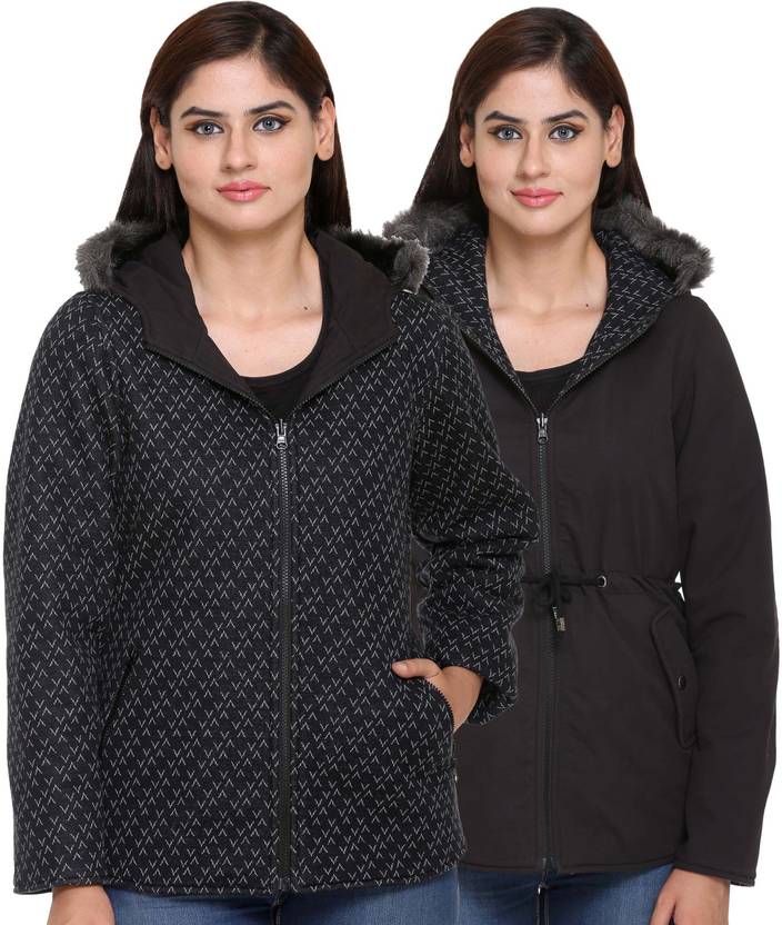 Trufit Fullsleeves Solid Women's Black Reversible Hooded Cotton Jacket