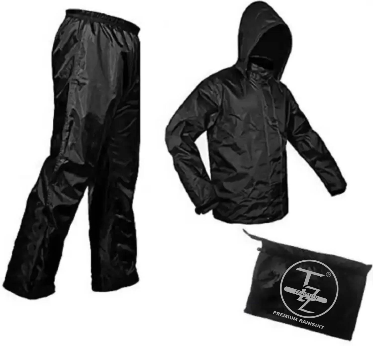 This waterproof rain suit includes a jacket and pant. Fabric gives ultimate protection and . This included waterproof fabric that's breathable and durable. Jacket features an adjustable hood with full front zipper. The pant features an elastic waist and a straight-leg design. Lightweight and packable design making it easy to pack and carry, great to carry everywhere . In-Box Contents : 1 Raincoat Set . MATERIAL : Polyester , COLOR-BLACK