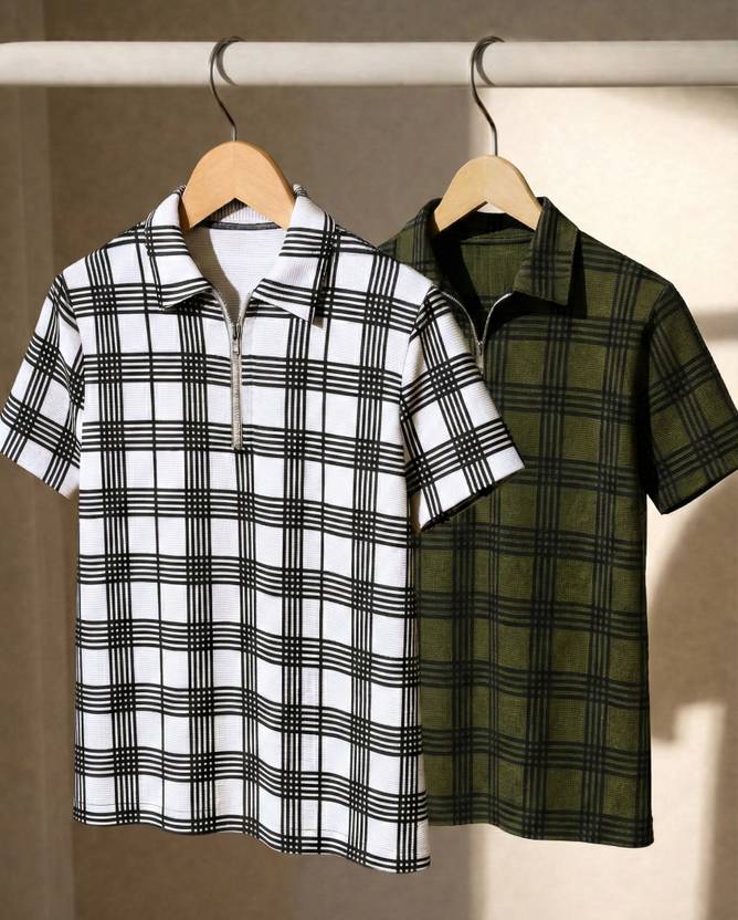 Try This Checkered Men Zip Neck Dark Green, Silver, Multicolor T-Shirt