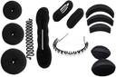 How To Use: Pull hair back into a high ponytail and secure with elastic at the crown. Place the hair donut at the very end of the ponytail and pull strands through the hole in the center. Slowly roll the hair donut (along with your hair) down the ponytail until you reach the base. Flip the bottom side of the hair donut upward from the inside out with both hands. As you roll, tuck loose strands underneath the donut. Tidy up loose ends and strands by pinning them around the base. TWIST HOLDER CLIP BUN : Tie your hair into a ponytail. High ponytail recommended for a classy and girly look. Place ponytail into hair sponge. Tighten hair sponge and pull down to perhaps the last quarter of your ponytail. Start rolling the hair sponge up towards the top of your head. Bend the ends of the hair sponge down to secure bun. Bobby pin the loose strands in, give it a puff of hairspray (optional) and you're all set! Decorate with hair accessories (such as flowers or hairbands) if you like. DONUT BUNS : All you need to do is roll, snap and wrap!! It's that easy!! DONUT BUN is Lightweight, Comfortable you can even sleep in it creating beautiful, Bouncy Curls and Waves.Set is available in Black, Brown, and Blonde. Choose set according to closest hair color match. HAIR DESIGNING : Enjoy your new hair style with this hair styling kit. EASY TO USE : Easy to use and to make your DIY hair styles. PERFECT STYLE KIT TOOL : It is a necessary tool set for women to hair designing with different styles. 1 x Small Bun Maker, 1 x Medium Bun Maker, 1 x Larger Bun Maker, 1 x Classic French Twist, 2 x Volume Hair Base, 1 x Fuwa Pin, 1 X Snacks Pati, 1 x Hair Ring.