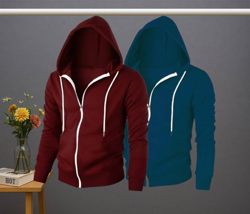 Try This Solid Men Hooded Neck Maroon, Dark Blue T-Shirt