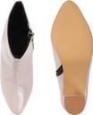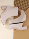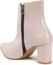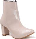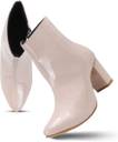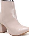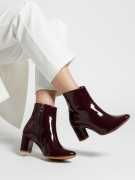 A pair of sleek "TRYME" ankle boots with a glossy, Synthetic leather finish. They feature a pointed toe, chunky block heel of moderate height, and a clean ankle-high silhouette. One boot shows a side zipper with a small metal pull for easy wear. The boots are displayed on a wooden platform against a soft neutral background, highlighting their polished, modern look—well-suited for dressy or smart-casual outfits.