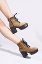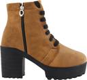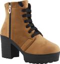 Step out in style with these chic tan block heel ankle boots. Crafted with a soft suede-like finish, these boots feature lace-up detailing with black laces, a convenient side zipper for easy wear, and a sturdy chunky block heel for all-day comfort. The rugged sole ensures extra grip and durability, while the fashionable design makes them perfect for pairing with jeans, dresses, or skirts. Ideal for casual outings or trendy street-style looks, these boots are a must-have addition to your footwear collection.