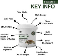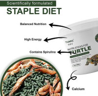 The turtle food is enriched with essential vitamins, providing a nutrient-rich diet crucial for your pet's health. These vitamins include A, D3, and E, which support vision, bone health, and immune function. Regular consumption of this vitamin-loaded pellets ensures your turtles receive the necessary nutrients for optimal growth and vitality. Give your turtles the best care with this food for a happy and healthy life.