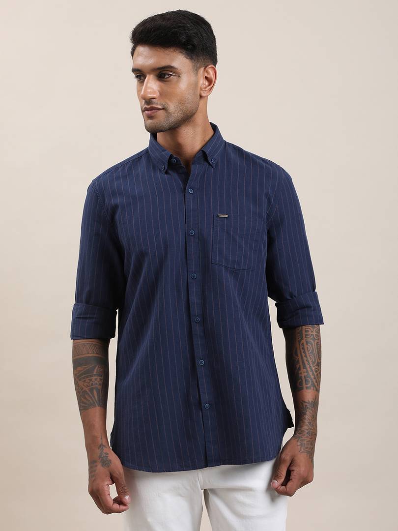 Men Slim Fit Striped Spread Collar Casual Shirt