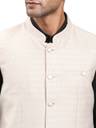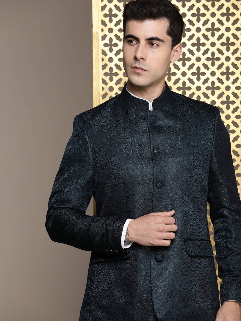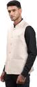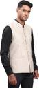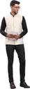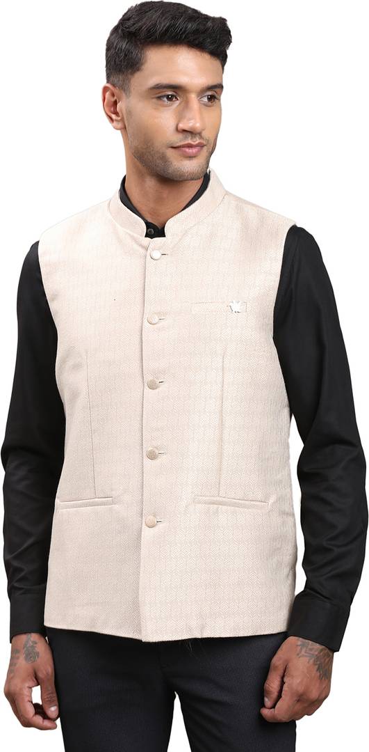 This men's waistcoat features a sophisticated band collar and a full button placket. Crafted from a fabric with a subtle geometric woven pattern, it includes two functional welt pockets at the waist and a small chest pocket adorned with a decorative pin. The sleeveless design is ideal for layering over shirts. It can be paired with formal shirts, casual shirts, and trousers for a refined look.