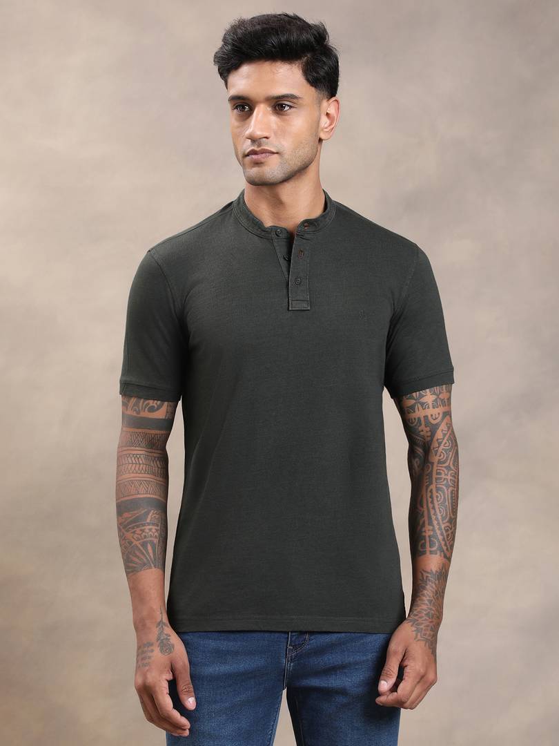 TURTLE Solid Men Henley Neck Dark Green T-Shirt