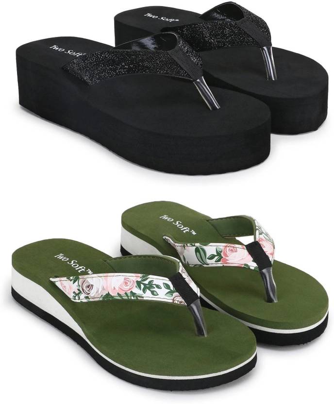 TWO SOFT Women Pack Of 2 Combo Stylish Extra Comfort Lightweight Dailywear Used Slippers (Black, Green , 6)