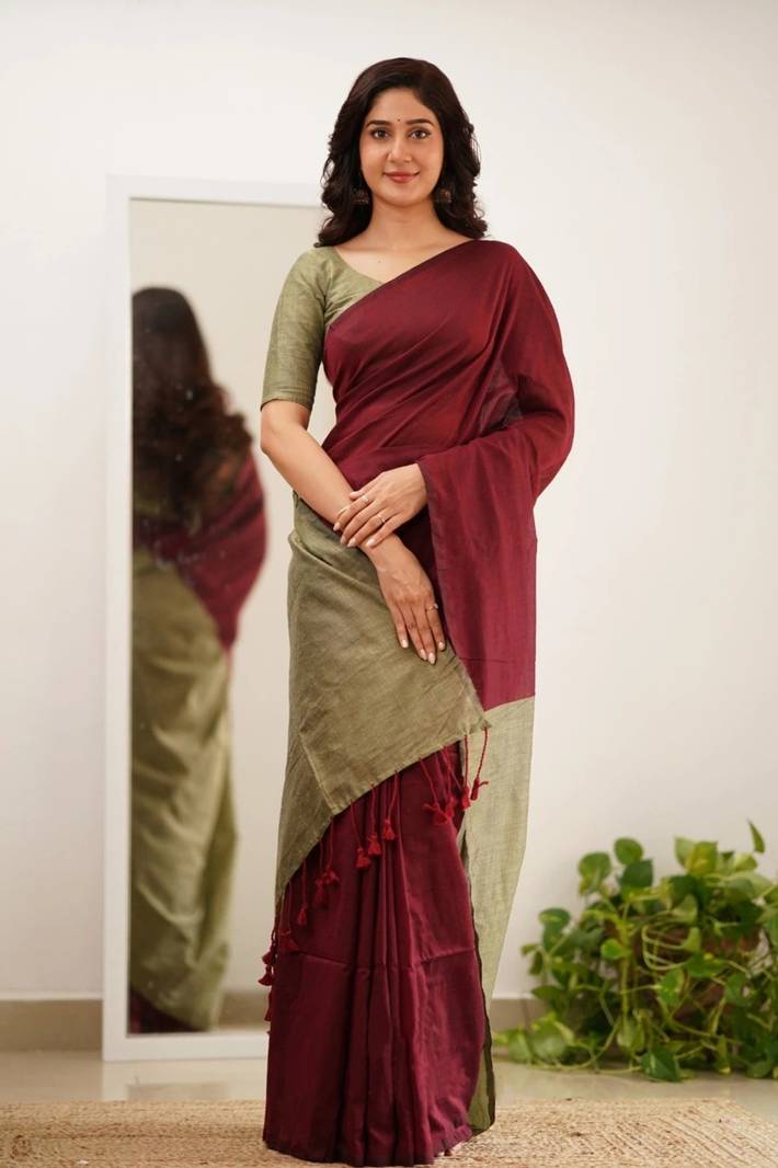 TWRIL Solid/Plain Handloom Pure Cotton Saree  (Maroon)
