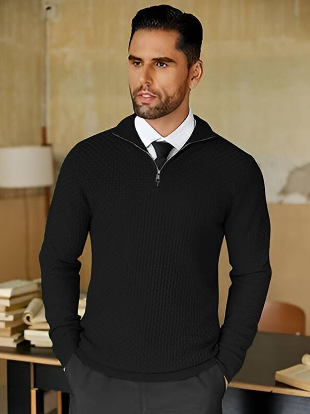 TYSORT Solid Collared Neck Casual Men Black Sweater