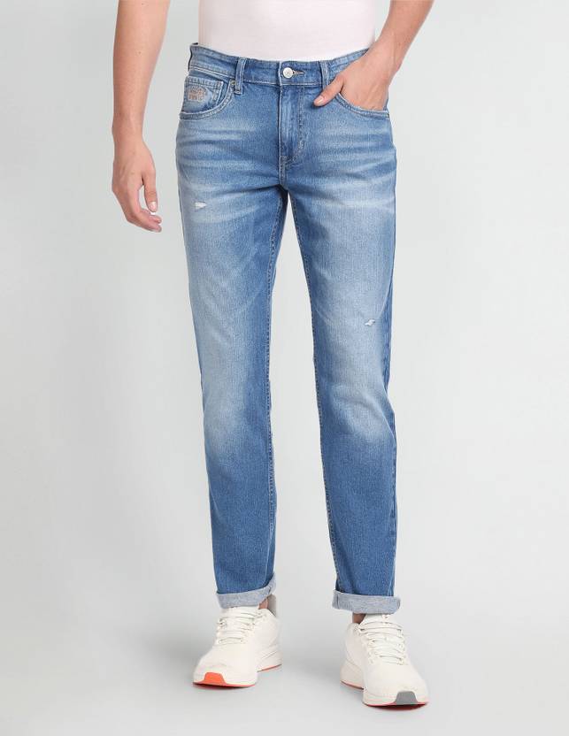 Sport these washed jeans featuring a mid-rise waist and slim tapered fit and distressed details on your next day out and about.