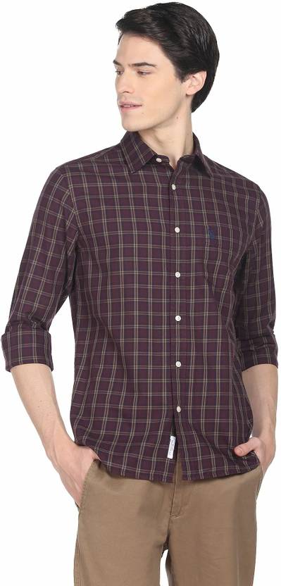 U.S. POLO ASSN. Men Checkered Casual Maroon, Beige Shirt