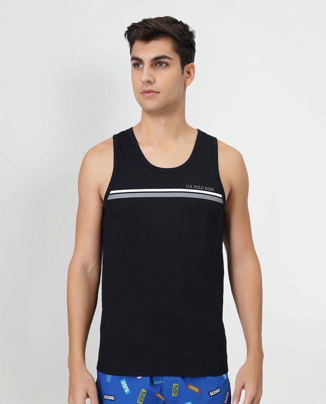 Men's Plain/Solid Black Round Neck Sleeveless Striped vest - Pack of 1 (#EV005). 100% Cotton. Ribbed round neck ensures shape retention that withstands repeated wash and wear. Sleeveless for easy and unrestricted movement. The pure cotton fabric has better breathability and absorbency. The product is tagless to provide a smooth surface and minimises any irritation. Prominent striped branding that connects you to the authentic heritage of U.S. Polo Assn.Knit construction ensures the material is lightweight and comfortable. The comfort fit ensures you have more space in the chest and torso area.