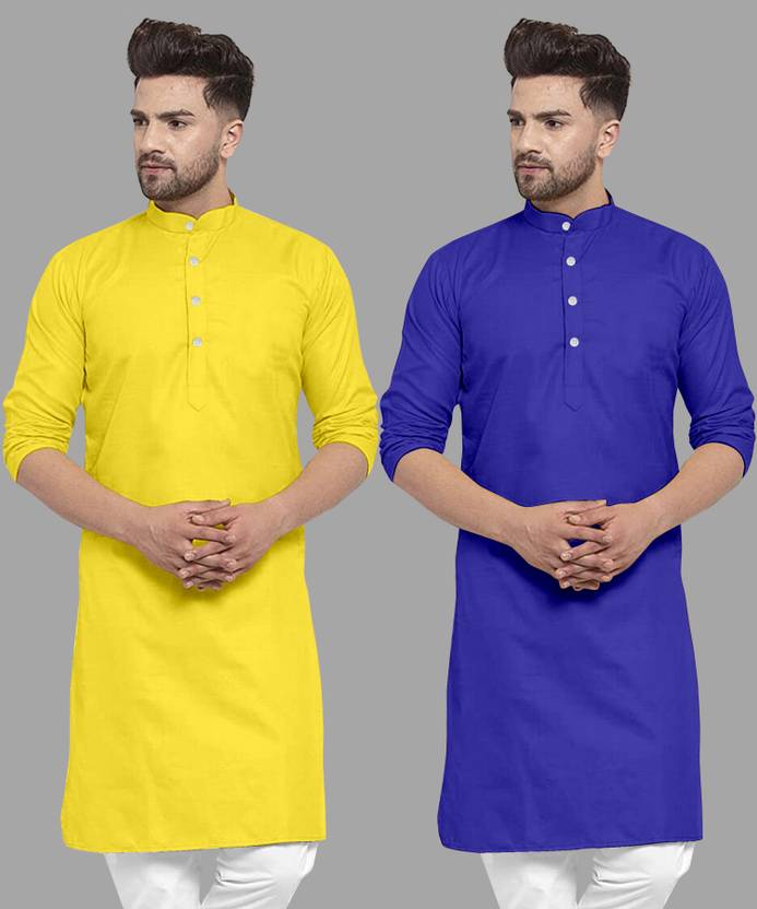 Pack of 2 Men Solid Cotton Blend Straight Kurta (Blue, Yellow)