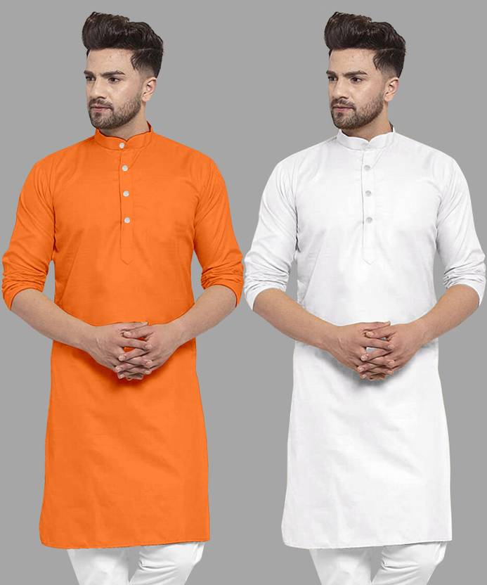 UDANIENTERPRISE Pack of 2 Men Solid Cotton Blend Straight Kurta (White, Orange)