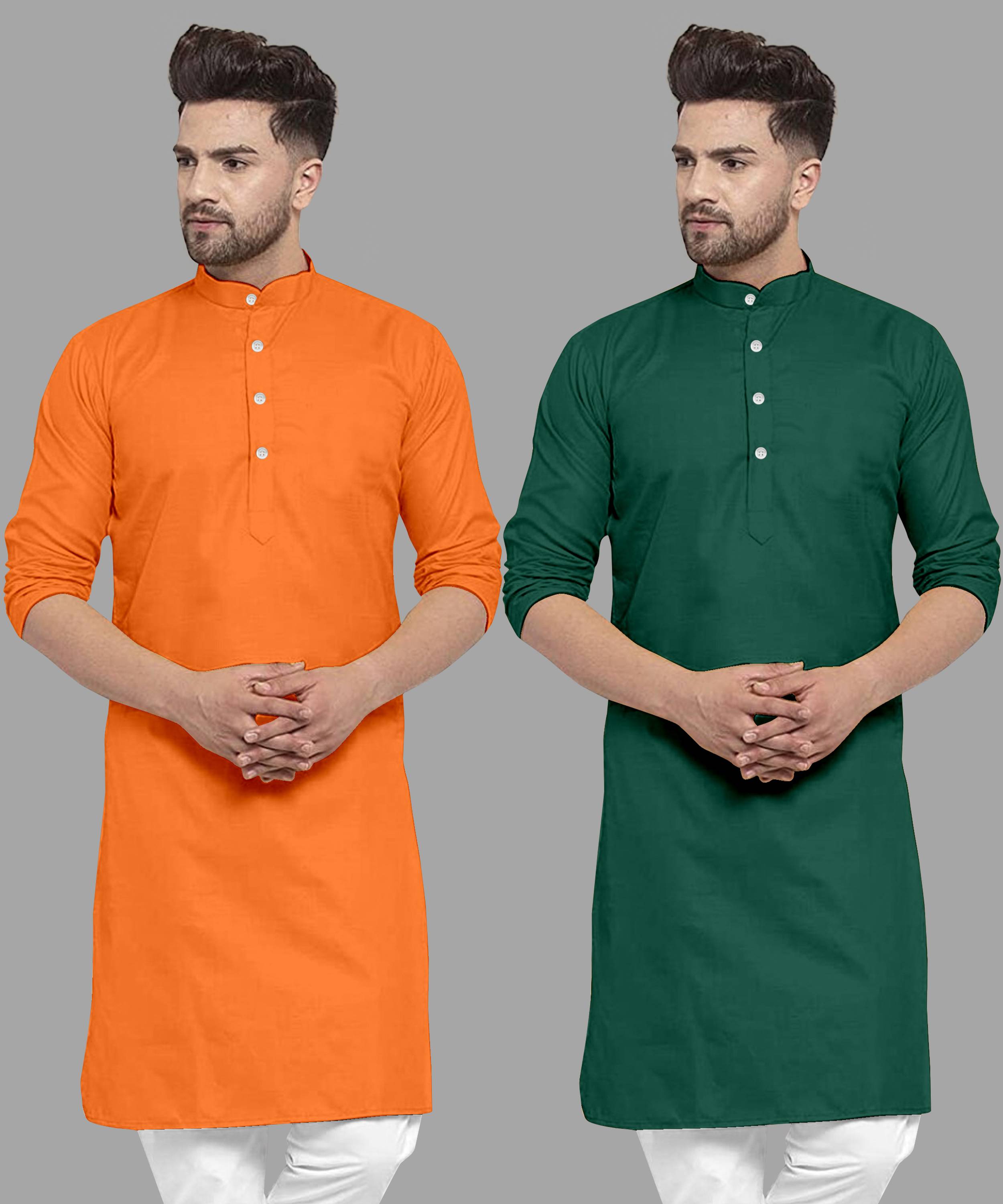 Pack of 2 Men Solid Cotton Blend Straight Kurta (Green, Orange)