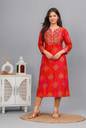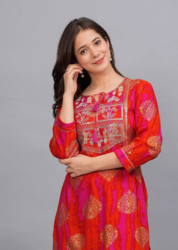 This eye-catching kurta from Udati Kaliya will help you maintain an elegant look all year long. Sport this orange & pink piece with studded flats and minimal jewellery for a simple yet stunning evening ensemble. It ensures both style and comfort. Experience the ultimate in luxury with the yoke design embroidery with gold print – a true epitome of fashion excellence.This embroidered rayon straight long kurta can make you look unique and stand out in a crowd. We also providing you many styling options in our catalog and these kurtis can be worn anywhere. You'll love the elegant design and fit of this stunning kurta. We come with a comprehensive range of shades and colours. These Straight kurta are made in light flowy rayon fabric which is soft. This kurta helps you looking a sophisticated look and enhance the beauty of the women which can be worn for functions, festivals, birthday parties and even wedding also. You will be a center of attraction in the event once you wear it. This embroidered straight kurta has a, round neck with tie up dori, three-quarter sleeves, straight hem, side slits and calf length. We offer exclusive and trendy styles at best deal price. Products are genuine and gone through rigorous quality checks.