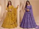 This combo pack features two stunning traditional Indian lehenga choli sets in elegant color variations Mustard & Purple Both lehengas are beautifully crafted with intricate embroidery and sequin detailing, offering a regal and festive look. Each set includes a matching embroidered blouse and dupatta, making them perfect for weddings, parties, and special occasions. The luxurious fabric and exquisite craftsmanship ensure comfort and style. Accessorized with traditional jewelry, this combo is ideal for adding variety and elegance to your ethnic wardrobe.