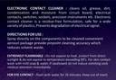 Where to use (Application) circuit board, electrical contacts, switches, sockets, precision instruments etc Directions for use Spray directly on the components to be cleaned convenient aerosol package provide pinpoint cleaning accuracy which reduces solvent waste. What does it do ? cleans oil, grease, dirt, condensation and moisture from circuit board, electrical contacts, switches, sockets, precision instruments etc. Electronic contact cleaner is a residue-free formulation, safe for a wide variety of plastics, Prevents degradation of electrical signal. Precaution: Do not expose to heat, protect from direct sunlight & do not expose to temperature exceeding 500c. For skin contact wash with mild soap & water. If swallowed do not induce vomiting seek medical attention immediately.