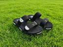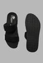 These black slides feature a comfortable design with two broad, woven straps across the foot. The sole is black with stylish white accents on the sides, providing a modern look. The contoured footbed ensures comfort for extended wear. Ideal for casual outings, beach trips, or lounging at home. Pair them with shorts, track pants, t-shirts, or swimwear for a relaxed and comfortable style.