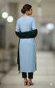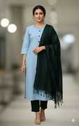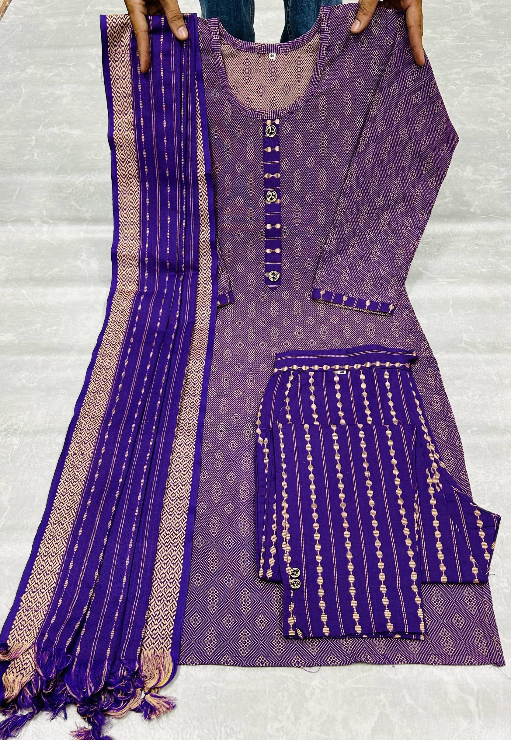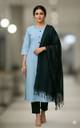 Crafted from high-grade khadi cotton fabric, the kurta of this ensemble combines comfort with luxury. This fabric is renowned for its breathability and softness, making it ideal for all-day wear. Besides being durable, it can be eco-friendly, promoting a sustainable and conscious fashion choice. Moreover, boasting the comfort of soft cotton fabric, the trousers and dupatta from this set are designed for enhanced style and ease.