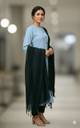 Designed with a flared A-line fit, the kurta can flatter your silhouette while ensuring comfort. Also, the ruffled round neckline and three-quarter sleeves add a feminine touch and promote easy fit. Moreover, the trousers flaunt a matching drawstring, allowing a customisable fit, which can facilitate free movement without compromising fashion. Furthermore, with its flowing drape, the dupatta adds depth and versatility to this outfit, enabling you to style it in various ways to suit your mood and the occasion.