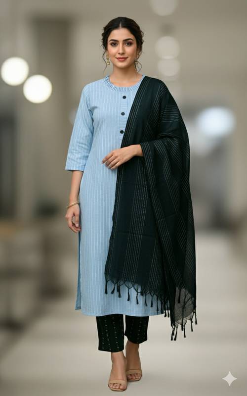 Featuring a timeless striped pattern, this women's dupatta, kurta, and trouser set exudes an air of sophistication and style. The stripes are carefully woven into the fabric, creating a subtle yet eye-catching design, that is ideal for any occasion. Thus, whether you're attending a cultural event or a friendly gathering, this set ensures you can make a statement with its classic aesthetic, making it a must-have for your wardrobe.