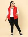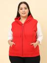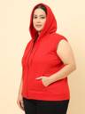Red solid plus size sweatshirt, has a hood, two pockets, sleeveless, zip closure, straight hem