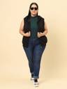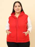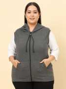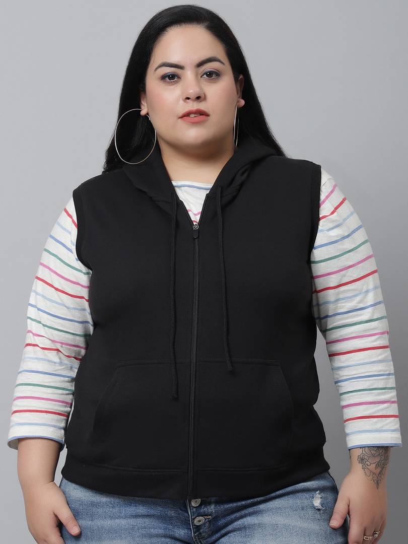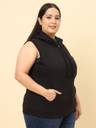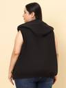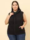Black solid plus size sweatshirt has a hooded, 2 front pockets, sleeveless, zip closure, straight hem