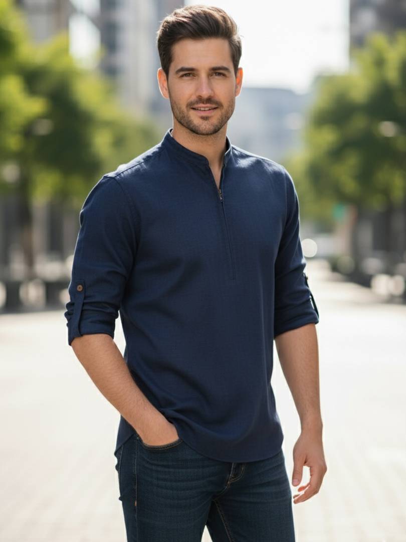 This Cotton Blend Short Kurta is perfect for men who value style and comfort. Its versatile design makes it ideal for any occasion—festivals, parties, or casual outings. Product Details 📋 👨‍🦰 Gender: Men 🎨 Pattern: Solid 🧵 Design Type: Plain 🔘 Closure: Zipper 👕 Sleeve: Full Sleeve ⬆️ Waist Rise: Mid-Rise 🪡 Hemline: Curved 🌿 Fabric: Cotton Blend 📏 Product Length: Short 📦 Material & Care 🧺 Fabric: Cotton Blend Wash: Suitable for hand wash and machine wash. How to Style 🎯 Pair it with dark-wash denim or linen trousers for a casual look. Dress it up with a pair of churidar or slim-fit pants for festive occasions. Add leather sandals or loafers and a wristwatch for a classy finish. Regular the sleeves for a relaxed vibe during daytime events. This shirt kurta seamlessly blends traditional elegance with modern styling, making it a wardrobe essential for every man! 👌