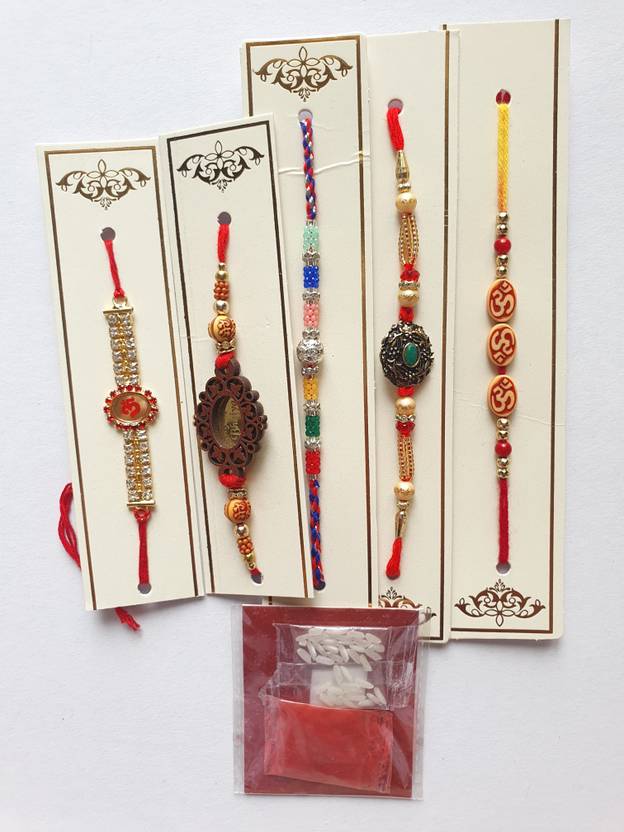 Designer 202815 Mauli Thread Chawal Roli Pack, Rakhi Set (5 Rakhi , 1 Roli Chawal)